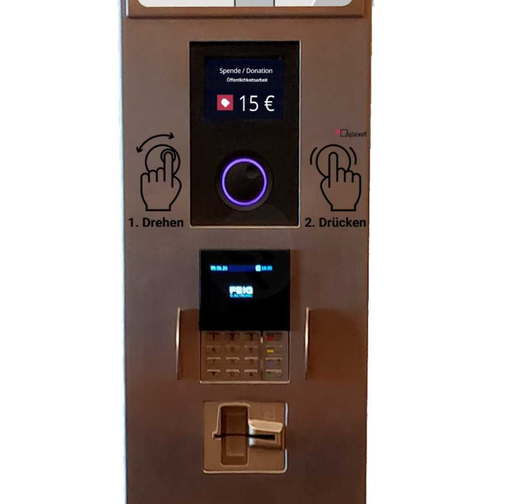 Die Digitale Spendensäule ist mit ihrem 1,80 m hohen Design-Edelstahlgehäuse sehr präsent, ihre Bedienung dank Display und Drehknopf kinderleicht. Das A4-Einschubblatt können Sie frei gestalten und einen von Ihnen gewählten Spendenzweck anzeigen lassen. Die notwendige Internetverbindung kommt via mitgelieferten LTE-Modul zu Stande.